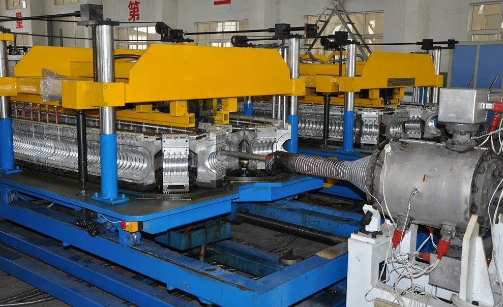 PE CORRUGATED สายการผลิตท่อเกลียวส่วนใหญ่ประกอบด้วยเครื่องอัดรีดแบบสกรูเดี่ยวตายบล็อกแม่พิมพ์ CORRUGATOR (เครื่องฟอง) เครื่องลากตัดเครื่องตัดและเครื่องคดเคี้ยว