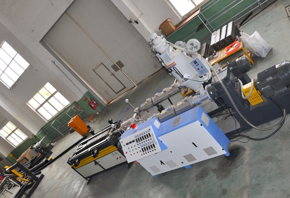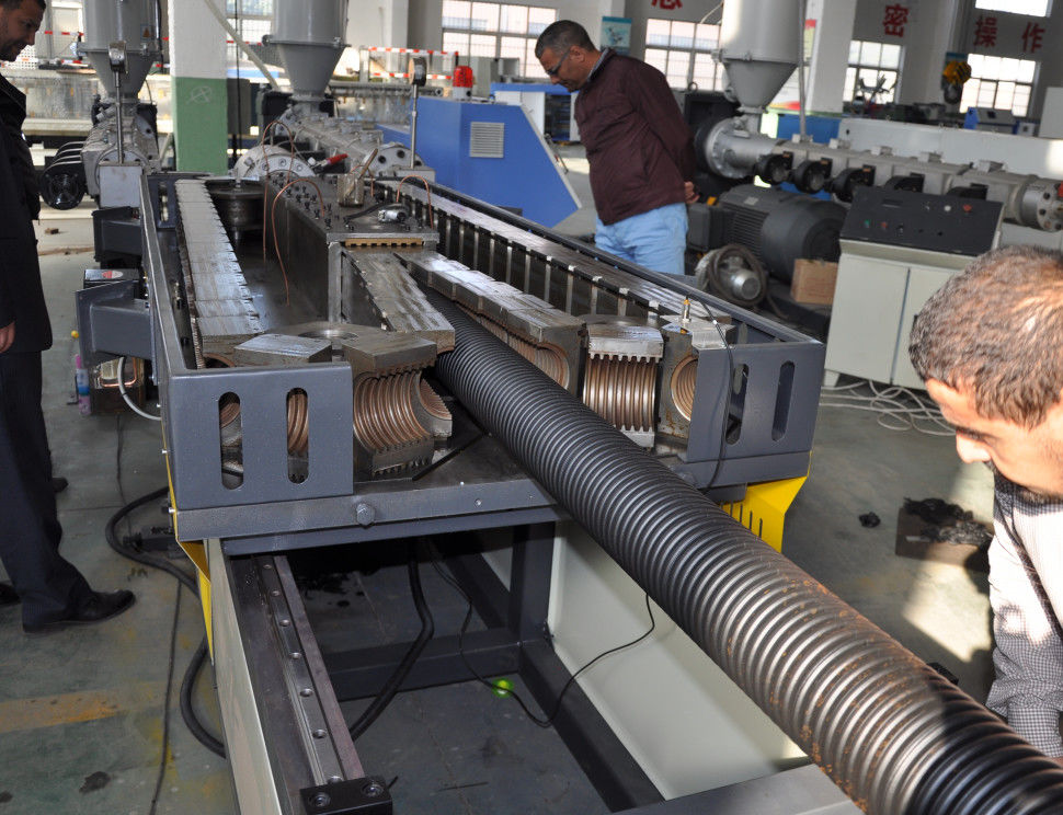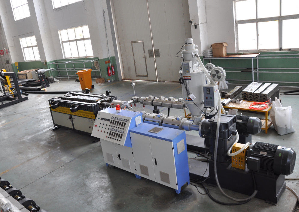 สายการอัดรีดท่อลูกฟูกผนัง signle นี้ส่วนใหญ่ประกอบด้วยเครื่องอัดรีดเครื่องขึ้นรูปลูกฟูกหัวตายและบล็อกแม่พิมพ์อุปกรณ์ระบายความร้อนเครื่องนับและเครื่องม้วนมันสามารถผลิตท่อลูกฟูกผนังเดี่ยวขนาดเส้นผ่านศูนย์กลางหลายชนิดอย่างต่อเนื่อง